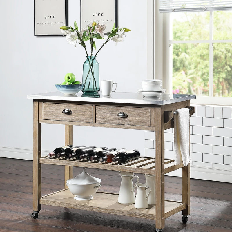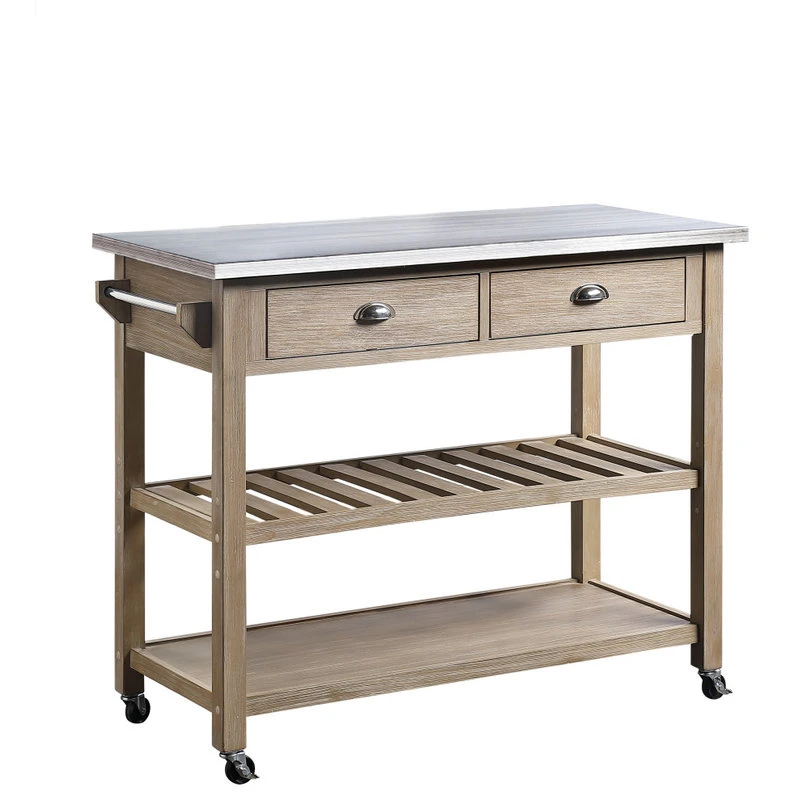 The Alex Kitchen Cart is a mix of modern farmhouse and industrial, creating the perfect contemporary piece. The two drawers with bottom mounted metal slides, and the two shelves provide much needed space for your kitchen essentials. The zinc metal top provides a great area to prepare meals or set out appetizers. The cart rests on 4, easy to move, casters, providing you with the necessary mobility. The Alex Kitchen Cart would be an excellent statement piece in kitchen, living room, etc. Clean with non-abrasive clothe.Features