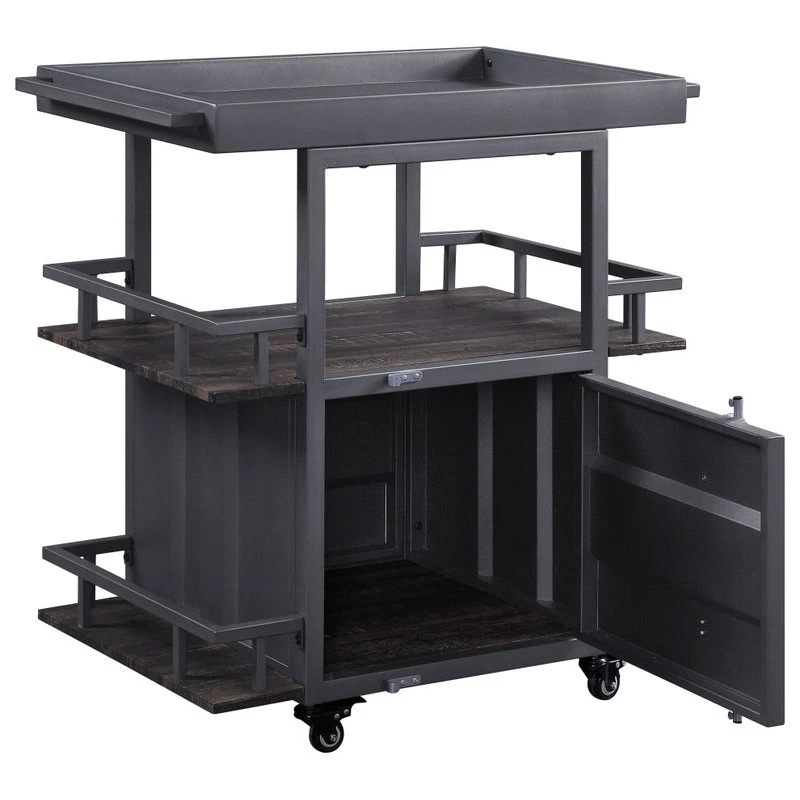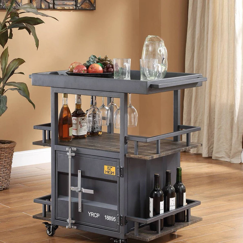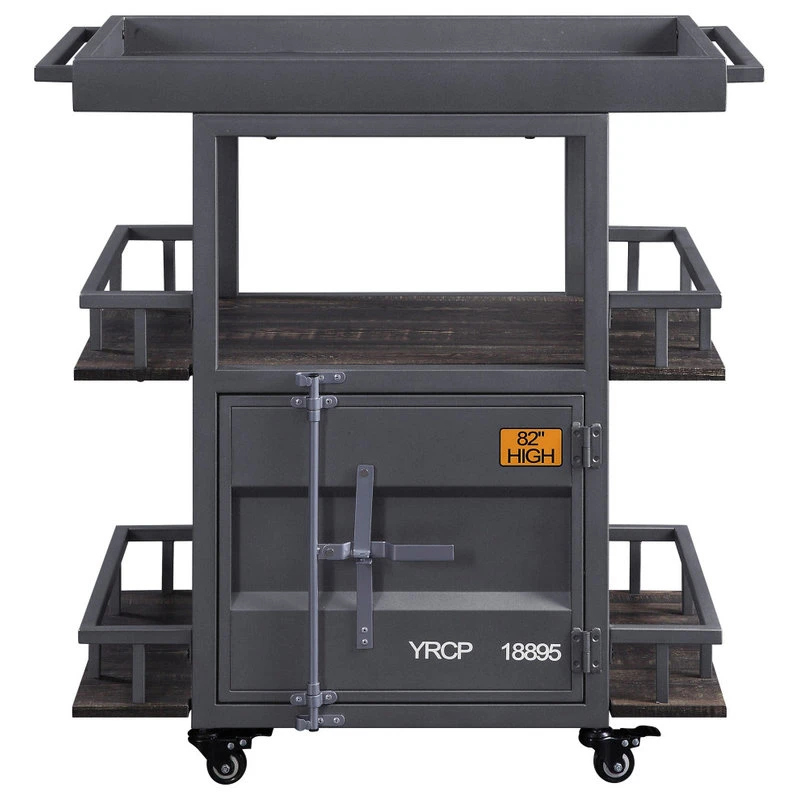 Accent your living or dining space in effortless style with the Cargo Serving Cart. The impressive design elements mix contemporary and industrial themes into one impressive transitional look. The unique serving cart features caster wheels and an antique walnut and finish with gunmetal finish accents that will revitalize any space. With three storage and display shelves and one storage compartment this cargo container style serving cart also provides storage space.