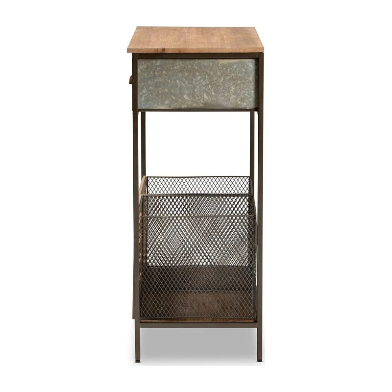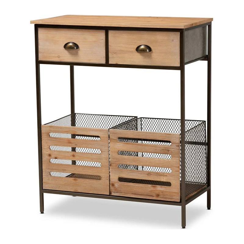 Organize your kitchen space with the rustic charm of the Abram cabinet. Made in China, the Abram is constructed from a unique combination of rustic oak finished wood and black finished metal for a farmhouse industrial vibe. Two drawers, featuring galvanized metal sides, provide ample space to store utensils and other supplies. Two removable baskets, showcasing meticulously cut-out faces, provide even more storage possibilities. The large, rectangular tabletop is well suited for preparing food or storing appliances. Fully assembled, the Abram is also fitted with non-marking feet for floor protection. Instantly upgrade the style and versatility of any kitchen space with the Abram cabinet.