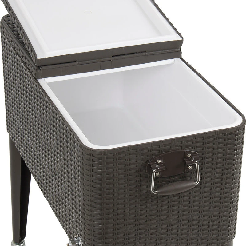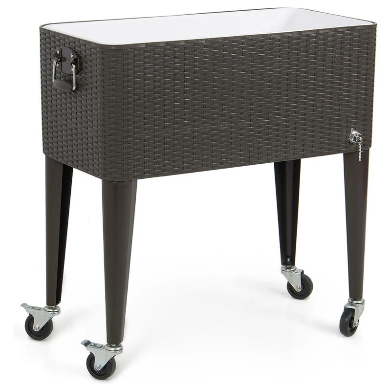 The Outdoor 80 QT Party Patio Cooler cart will specially come in handy when you are enjoying outdoor living. The cooler itself has handles on each end and dual flip-up lids for easy access from either side. A drainage plug is located on the back so you can easily remove excess water while a bottle opener with a bottle cap catcher is attached to the front so you never have to search for a way to open your drink or have to clean up all of the bottle caps the next day