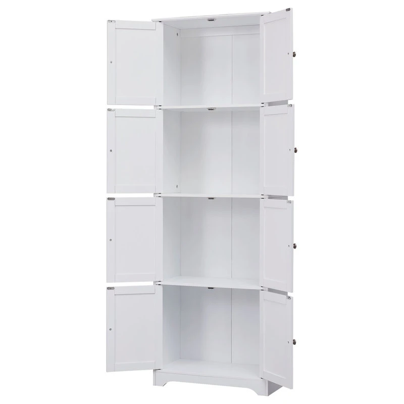 Bushnell 4 Tier Contemporary Kitchen Pantry Storage Cabinet, White Wood. Create a functional and stylish statement in any room where a little extra storage is needed with this tall Bushnell Kitchen Pantry Cabinet. With four interior shelves perfect for dishes, packaged foods, or cookbooks, this Bushnell Pantry Cabinet is perfect for storage without the clutter. Crafted from manufactured wood in a neutral hue with a reinforced backboard, it also includes wall mounts for enhanced stability.