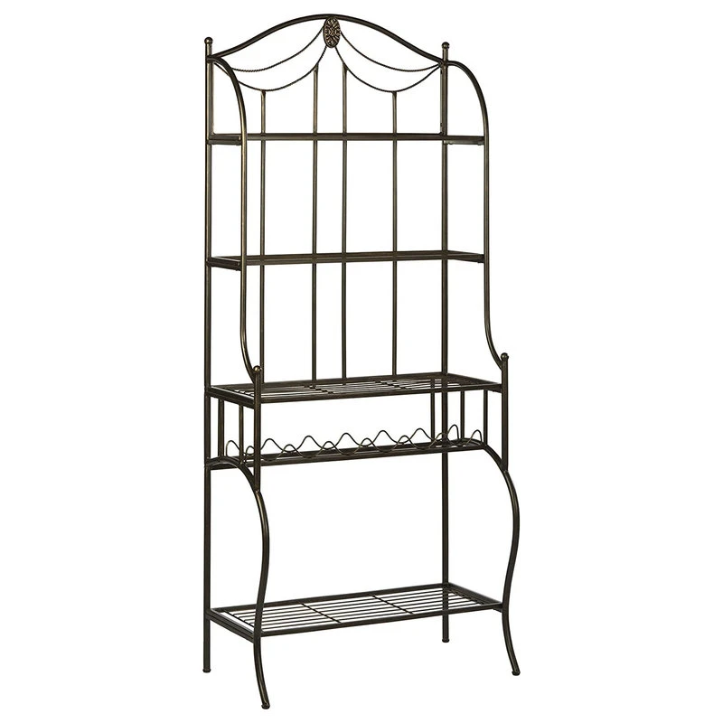 - Features 4 functional metal shelves and wine rack that holds up to 6 bottles of wine