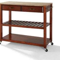 Constructed of solid hardwood and wood veneers, this kitchen island is designed for longevity. The beautiful raised panel doors and drawer fronts provide the ultimate in style to dress up your kitchen. Two deep drawers are great for anything from utensils to storage containers. Behind the four doors, you will find adjustable shelves and an abundance of storage space for things that you prefer to be out of sight. Style, function, and quality make this kitchen island a wise addition to your home.