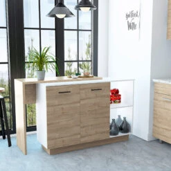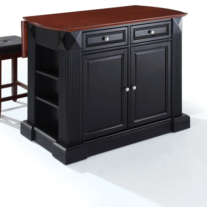 Constructed of solid hardwood and wood veneers, this kitchen island is designed for longevity. The handsome raised panel doors and drawer fronts provide the ultimate in style to dress up any culinary space. Raise the drop leaf to expand your serving space, or just sit at the breakfast bar and eat your meal. Behind the doors, you will find adjustable shelves and an abundance of storage space for objects you d prefer to keep hidden. Open storage on both ends provides easy access to frequently used items, and is perfect for displaying decorative objects. Raised diamond accents and fluted pilasters are sure to impress your guests. Style, function, and quality make this kitchen island a wise addition to your home.