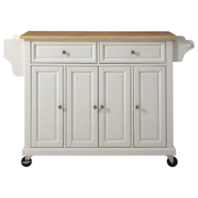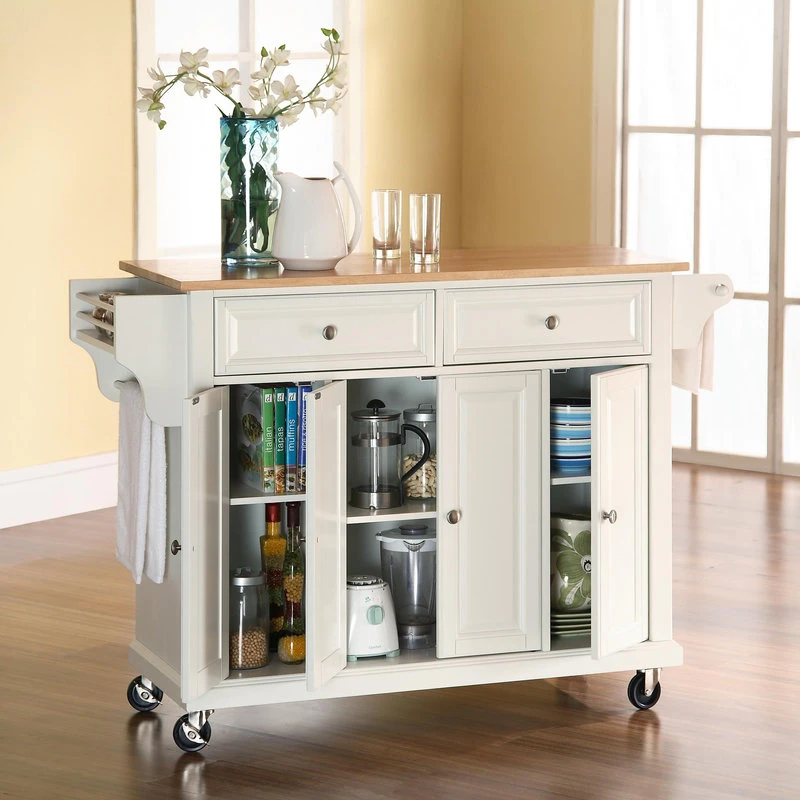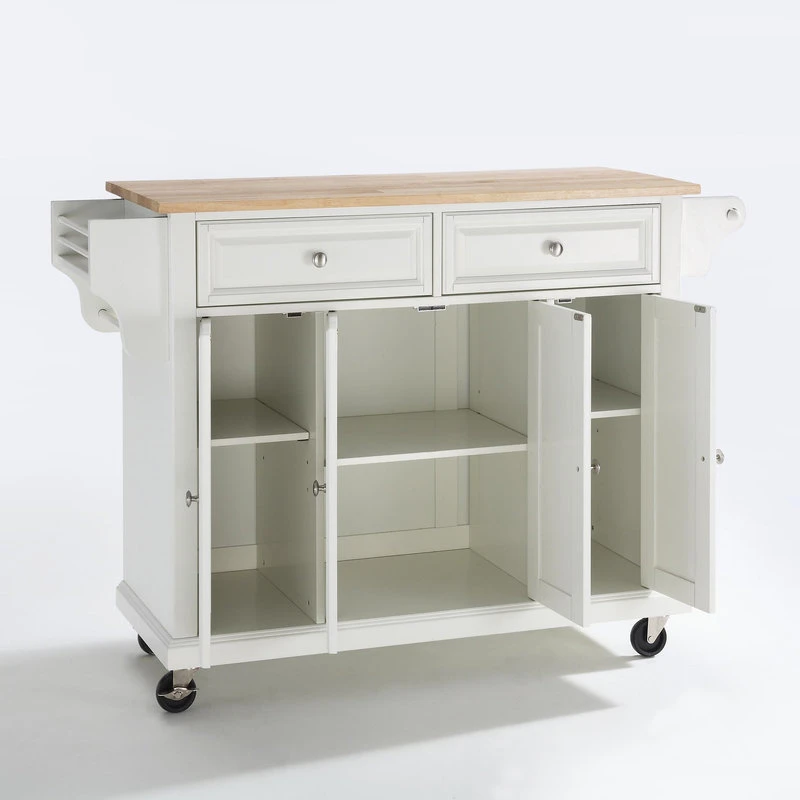Constructed of solid hardwood and wood veneers, this mobile kitchen cart is designed for longevity. The beautiful raised panel doors and drawer fronts provide the ultimate in style to dress up your kitchen. Two deep drawers are great for anything from utensils to storage containers. Behind the four doors, you will find adjustable shelves and an abundance of storage space for things that you prefer to be out of sight. The heavy duty casters provide the ultimate in mobility. When the cabinet is where you want it, simply engage the locking casters to prevent movement. Style, function, and quality make this mobile kitchen cart a wise addition to your home.