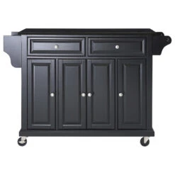 Boasting a traditional raised panel design, this mobile kitchen island from Crosley is defined by its rich hand-rubbed chocolate finish and solid granite top. Equipped with two deep drawers and four cabinet doors, opening to reveal adjustable shelves and an abundance of storage space, this piece is also fitted with a spice rack and towel bar, as well as heavy duty casters to provide ultimate mobility. Elegantly combining style with function, Crosley’s classic cherry Solid Black Granite Top Kitchen Island is sophisticated yet unpretentious, making a timeless addition to your kitchen.