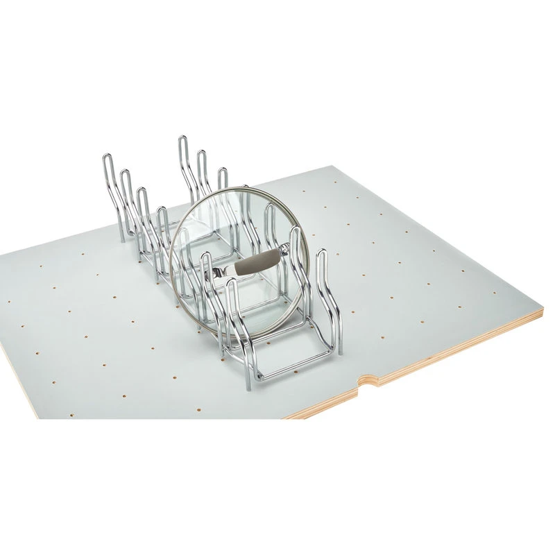 Organization is one thing every good chef has in common and now you can too with the use of our chrome lid organizer for deep drawers. Designed to work with our 4DPS and 4DPBG peg boards. This easy press-in rack keeps up to six lids organized, in reach, and when used in combination with our 5DCD-1-CR pot and pan holder you have a complete cooking station at your fingertips.