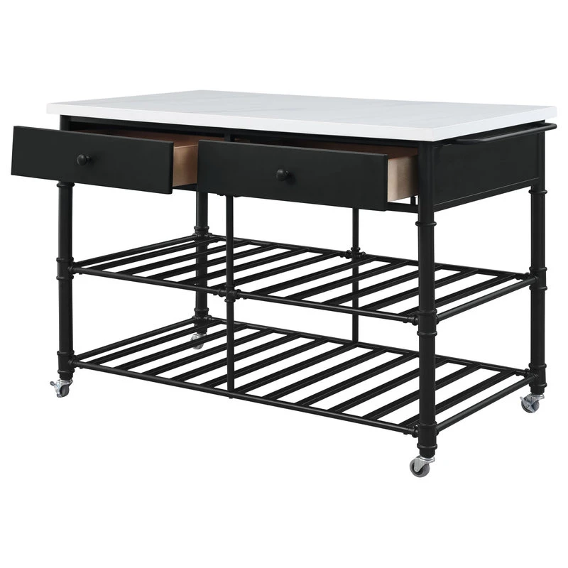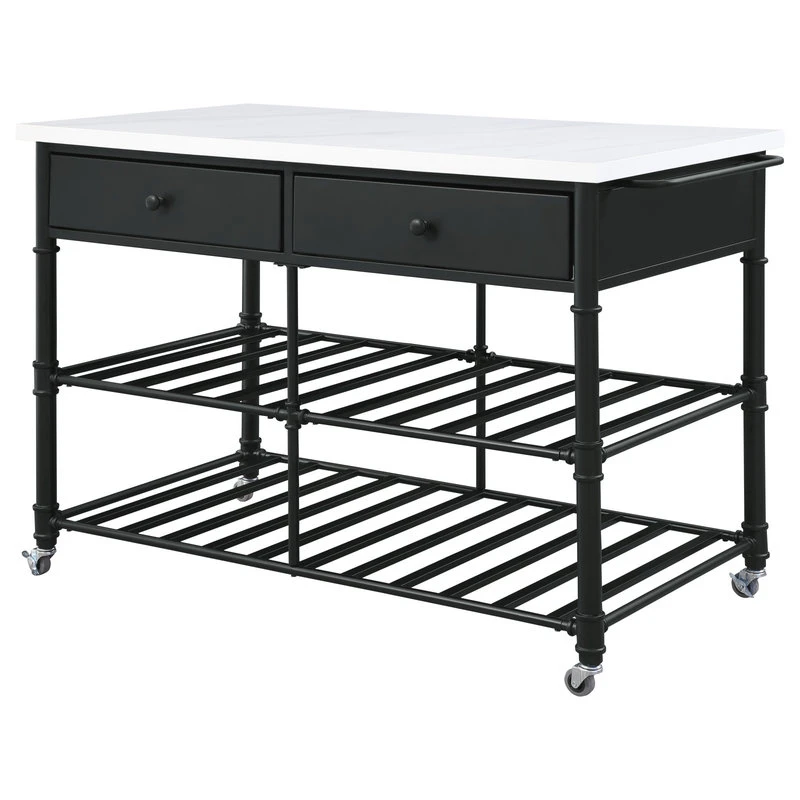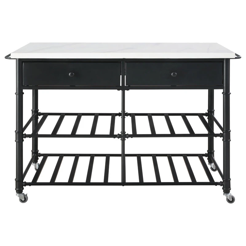 Give off a light and airy feel to a compact cooking space. The Emery Kitchen Island features a artificial stone top paired with two metal slatted shelves, creating a sleek, timeless silhouette that bring your kitchen an open feel. Two storage drawers and hanging rods help you organize a variety of tools in your kitchen. Four caster wheels roll easily, providing excellent mobility to this piece. Use this stylish yet functional addition to complete your kitchen decor.
