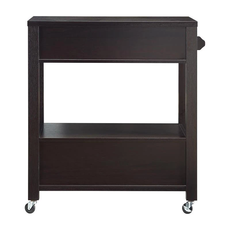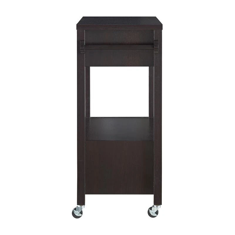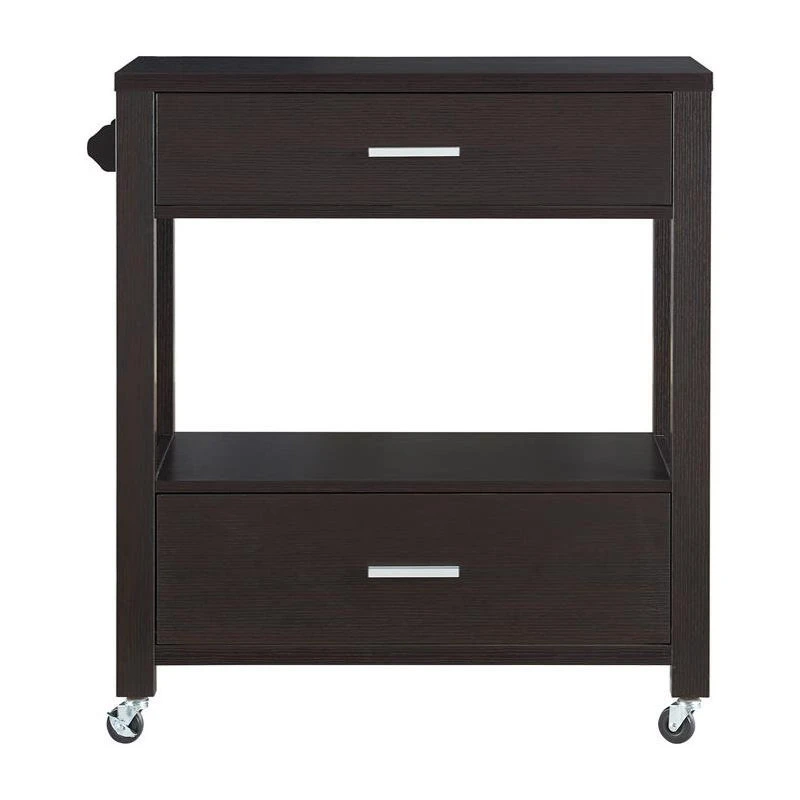 A crisp silhouette lends classic charm to this contemporary cappuccino wood kitchen cart. A spacious surface and open shelf provide plenty of space for drinks and barware, while the two drawers offer concealed storage space like foil cutters, corkscrews, and bottle stoppers. This charming kitchen cart is complete with a towel rack and sits atop casters for easy mobility from room to room.