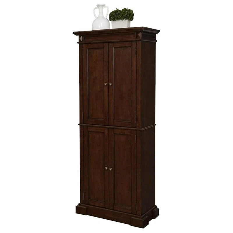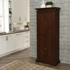 Add a stylish way to make the most of your kitchen storage space with this Homestyles Americana Pantry. The solid hardwood construction features a distressed oak finish with antique nickel finish hardware. Carved door panels and diamond-shaped details give this piece a craftsman feel, while the spacious storage cabinets make it work harder for you, no matter where you place it.