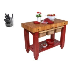 Prepare meals with ease with the help of this sturdy gathering block table. With a durable 4-inch thick hard end-grain maple top, this kitchen island is ideal for chopping, dicing, peeling or general food preparation. Three wicker baskets as well as a slatted lower shelf provide storage space, while a charming barn red base adds rustic style. Make this John Boos gathering block table the handsome headquarters for all of your kitchen prep work. This maple island table adds functionality, along with plenty of charm, to any kitchen. As a special added , your purchase of this John Boos table includes a knife block set from Henckels. This Beauty is made and shipped direct by John Boos. This is made in Good Ole USA. The quality is superb and Even found in the White House. This also comes with a J. A. Henckels Knife set.
