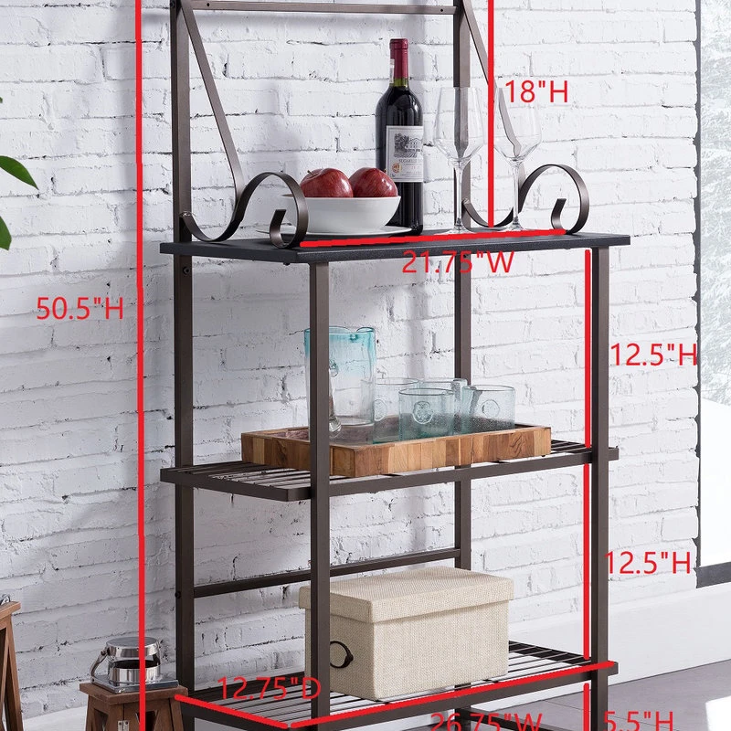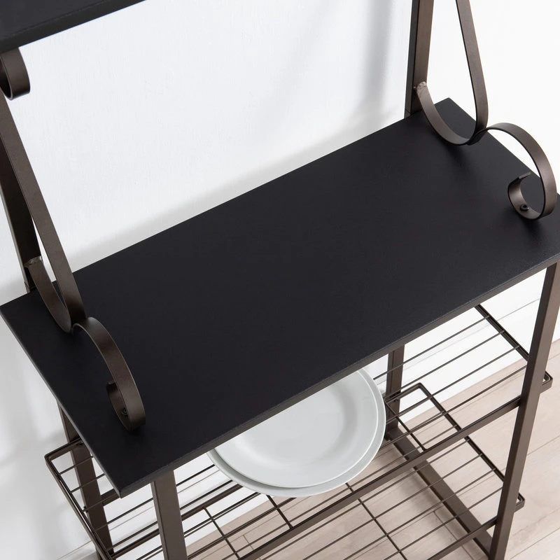 Kalamazoo 4 Tier Free Standing Kitchen Bakers Rack, Pewter Metal Frame & Black Wood Center Shelf, Transitional. Give your hallway or kitchen stylish storage with the Kalamazoo 4 Tier Bakers Rack. Transitional in style, this piece features a pewter finish frame and a black wood center shelf.