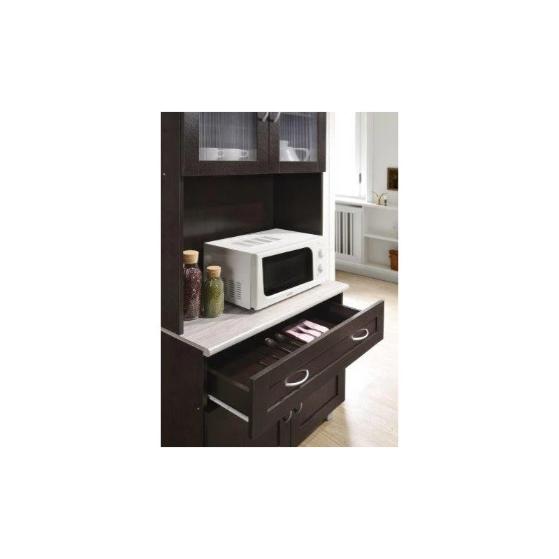 Hodedah Kitchen Cabinet with 1-Drawer, plus Space for Microwave in Chocolate-GreyHIKF96 CHOCO-GREY Hodedah Kitchen Cabinet with 1-Drawer, plus Space for Microwave in Chocolate-Grey, Running out of cabinet space in your home, The Hodedah China Cabinet is a simple yet versatile piece that is sure to add functionally to your kitchen. Standing tall this unit features a large open shelf space at the center to house your microwave or toaster oven. Transparent doors on the top opens to reveal two shelves, ideal for displaying fancy dinnerware. For extra storage there is another enclosed cabinet below to store small appliances, pots and pans. The single drawer located in the center of this unit provide ample room to store cutlery, kitchen towels and other small gadgets. So go ahead and bring this cottage inspired piece into your home, not only will it provide ample storage from top to bottom but it will serve up functionality and versatility. Convenient and accessible way to store your microwave, toaster and other small appliances