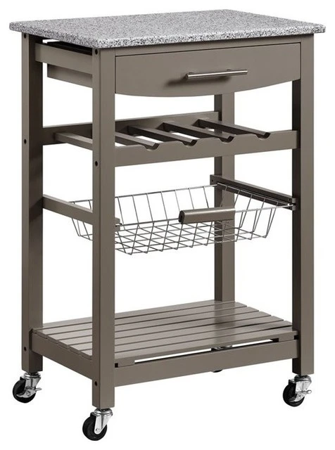 Transform your kitchen with a multifunctional mobile island! This charming, farmhouse style cart features a front drawer, four bottle wine rack and bottom shelf for utensils, dinnerware, linens and more. A wire basket pulls out for easy access to fruits and veggies. The gray and white granite countertop is food safe and easy to maintain. It accommodates a coffee maker or compact microwave. Designed for kitchen use, rolling, locking casters make this island equally at home entertaining in the dining room or on a patio.