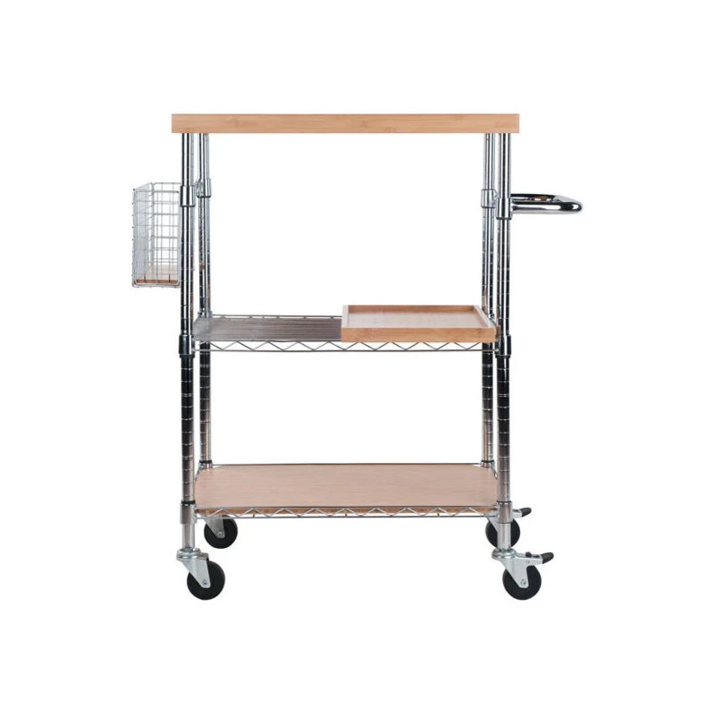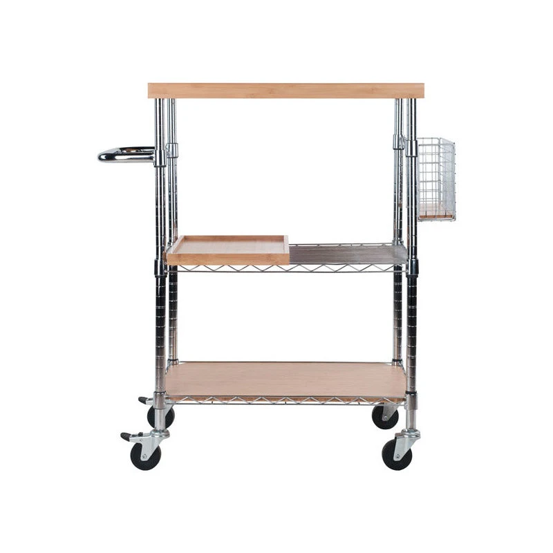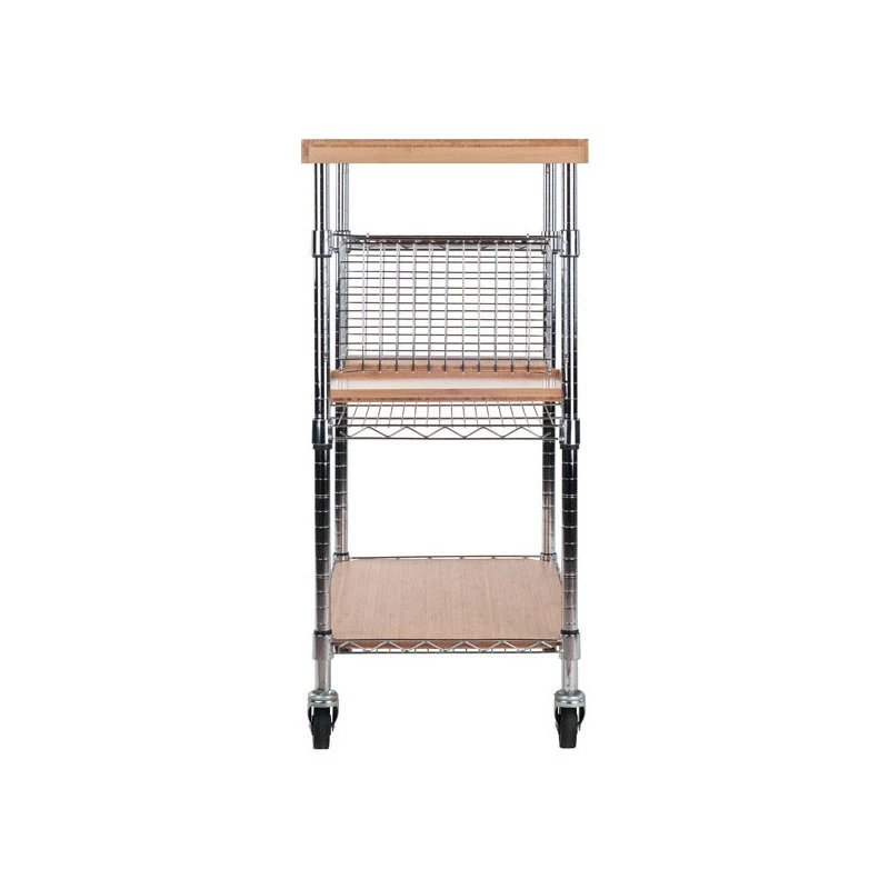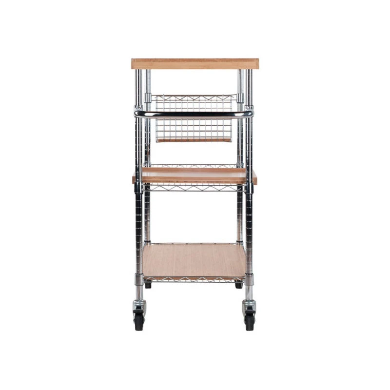 Crisp, clean and flexible, the Madera Kitchen Cart will serve you well whenever and wherever you want to expand your kitchen, dining or entertaining workplace. The Cart features adjustable set-up heights on the shelves, caddy, and even the handle, so you can best position each to suit your needs. Chop vegetables and prepare hors d’oeuvres on the natural bamboo cutting board top, while keeping utensils or bottles of wine in the caddy. The rolling cart’s sturdy metal shelves will carry everything you need from the kitchen to the dining area, family room, or patio. A removable serving tray can be used to store glassware, bottles and bowls. The top surface, lower shelf insert, caddy insert, and the serving tray are made of natural bamboo. The frame, shelves, and basket are constructed of smooth chrome metal for a bright look. The cart rolls easily on professional grade casters, two of which lock for stability while in use.