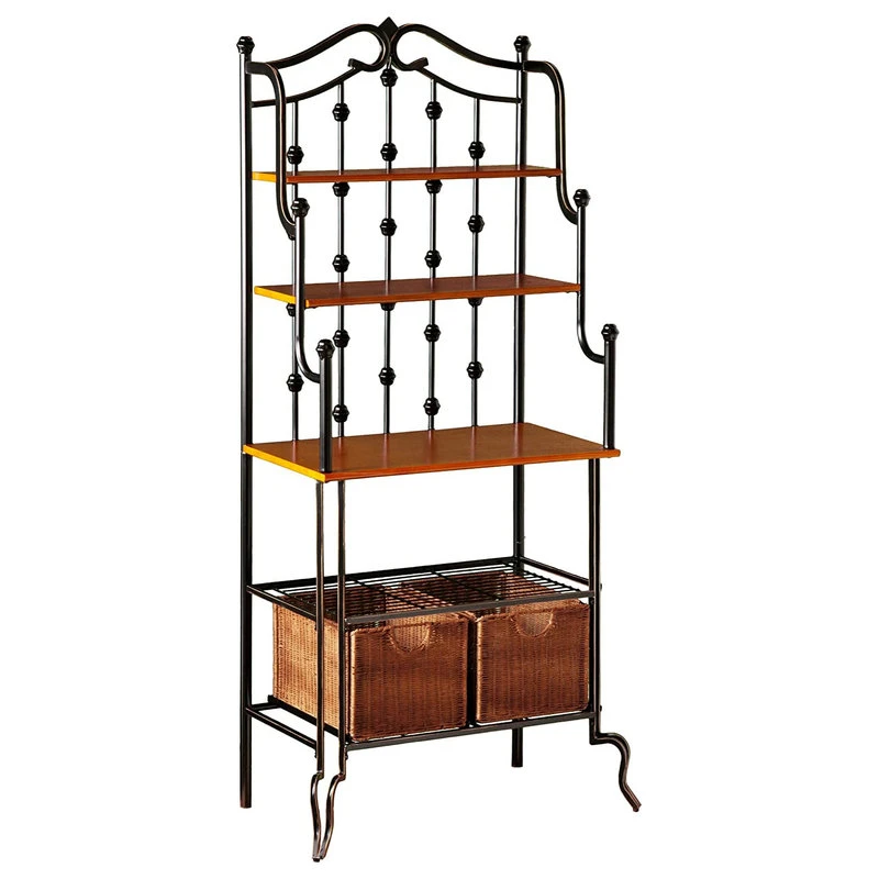 - Bakers rack features 1 spacious countertop, 2 upper shelves, and 2 large rattan storage baskets with wire shelf