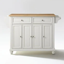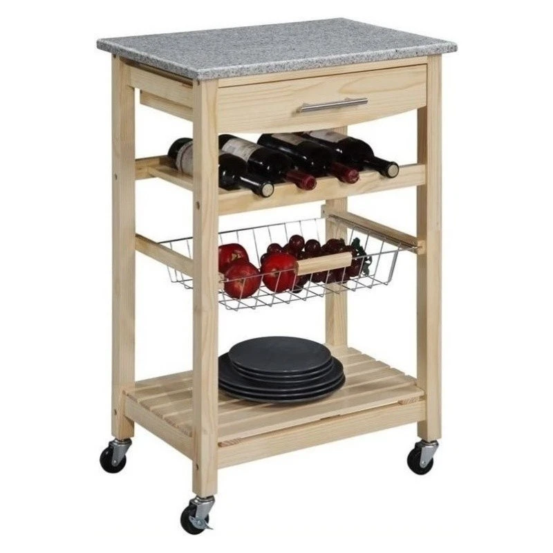 Expand your kitchen workspace with this natural finish work island featuring an elegant granite top. The cart is complete with chrome finished hardware, a slide out wire storage basket, one fixed shelf, 4 bottle wine storage rack, a spacious pull out storage drawer, and heavy duty locking rubber casters for easy mobility and safety. The back of the cart is fully finished. Small enough to store neatly in your kitchen, yet large enough to provide extra work space needed.