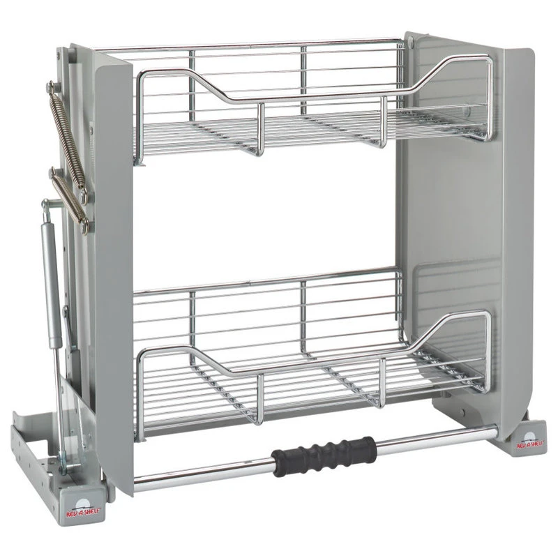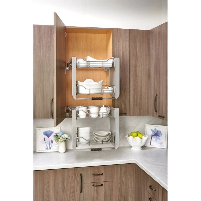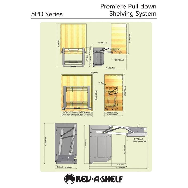 Tired of dragging the dining room chair into the kitchen to reach everything in your wall cabinet? Introducing Rev-A-Shelf’s magnificent Pull-Down Shelving System. The 5PD Series is a chrome-plated two-tier pull-down shelf that brings hard-to-reach items down 11-1/2″ while pulling out 16-3/4″ from the cabinet. This functional pullout features a unique gas assisted lifting/lowering mechanism that provides unparalleled stability through the entire range of motion. The Pull-Down Shelving System includes both side and bottom mount brackets and is available for Wall 24″ and 36″ cabinets.