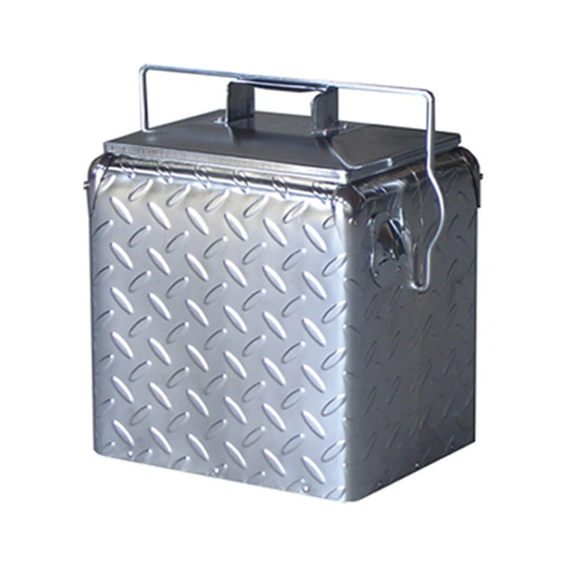 Retro Vintage 13L rugged steel Ice Chest insulated Cooler. Light weight with lift off top holds 10 bottles or 12 cans tough Classic Polished Diamond Plate finish with durable urethane liner.