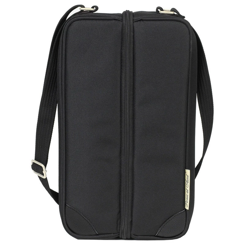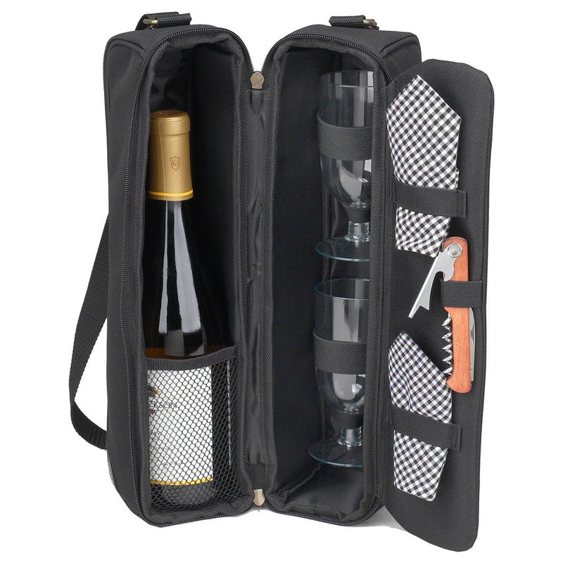 Top quality deluxe wine holder with glasses featuring state of the art Thermal Shield insulation cooler to maintain wine at the perfect temperature. Glass compartment can be used to hold a second bottle. Contains two glasses, napkins, corkscrew and wine stopper. Adjustable shoulder strap. This stylish gift will always impress.