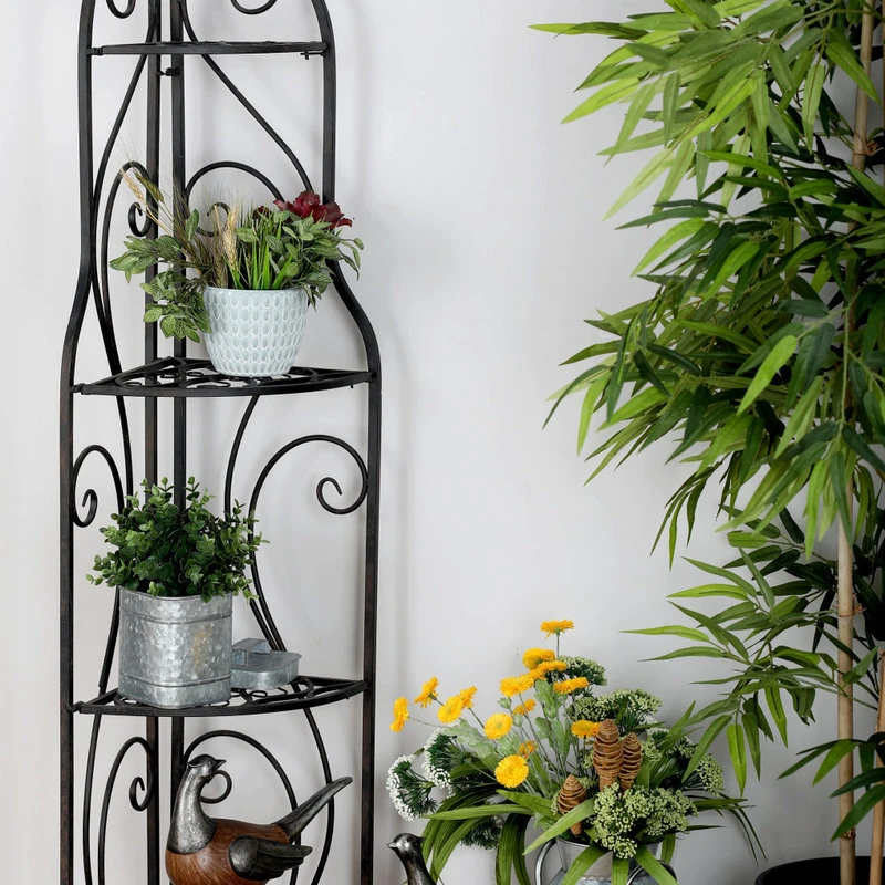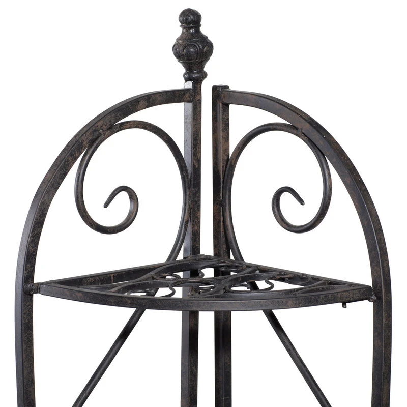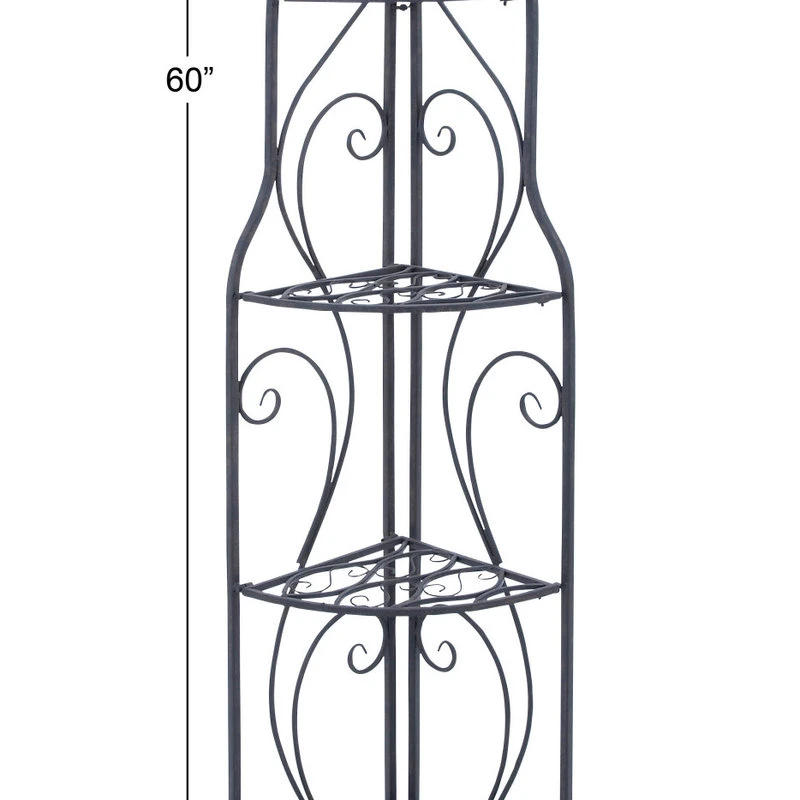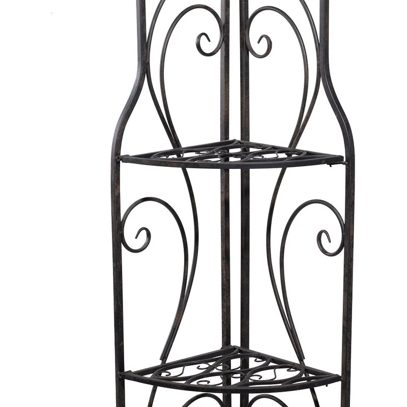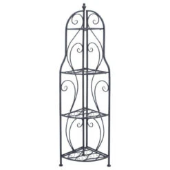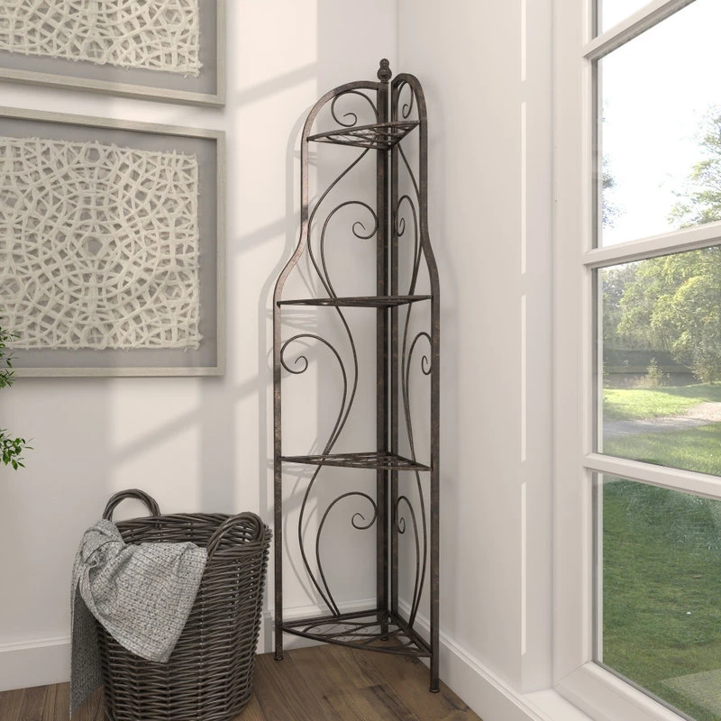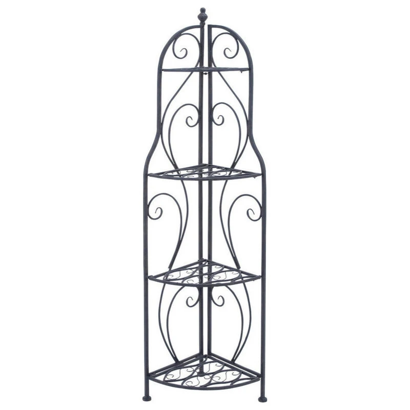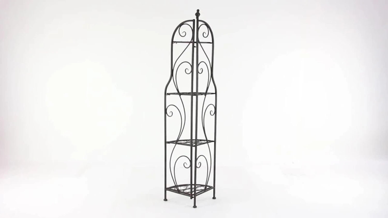 A storage piece that is spacious to keep your valuable organized and safe. Appreciate their design best against solid-colored backgrounds. Add the shelf to any corner of your patio, kitchen, or entryway.. Designed with felt or rubber stoppers at the base that prevent scratching furniture and table tops, as well as sliding around. This item ships in 1 carton. Suitable for indoor and outdoor use. Maximum weight limit is 40 lbs. This is a single bakers rack. Iron bakers rack features 4 shelves. Traditional style.