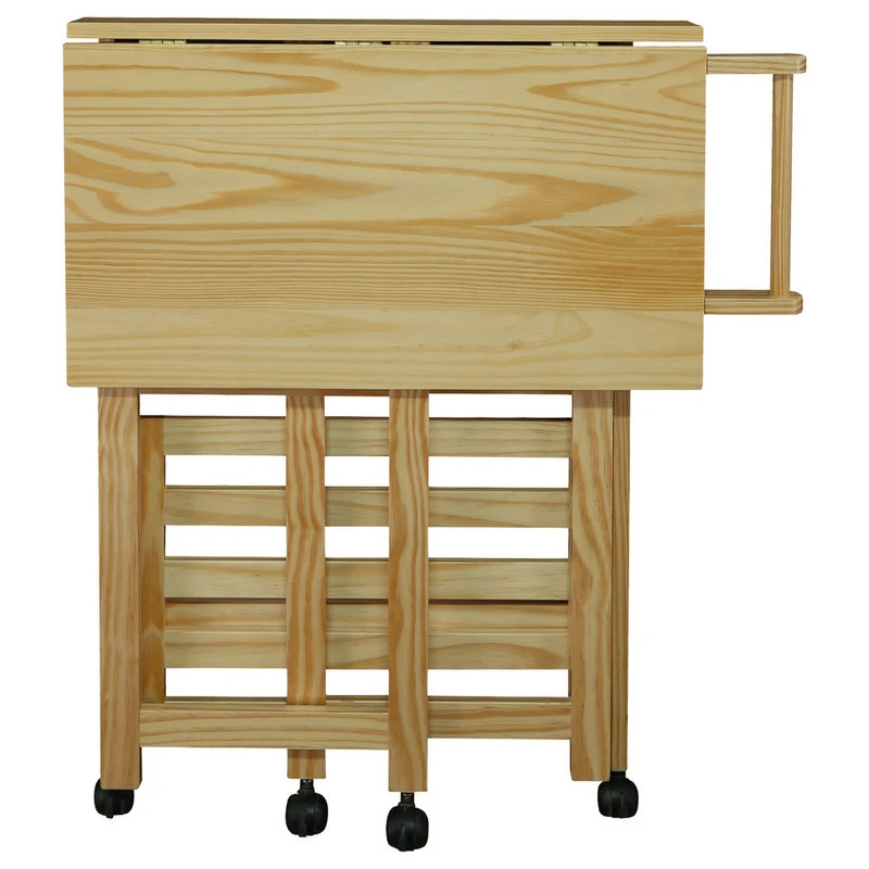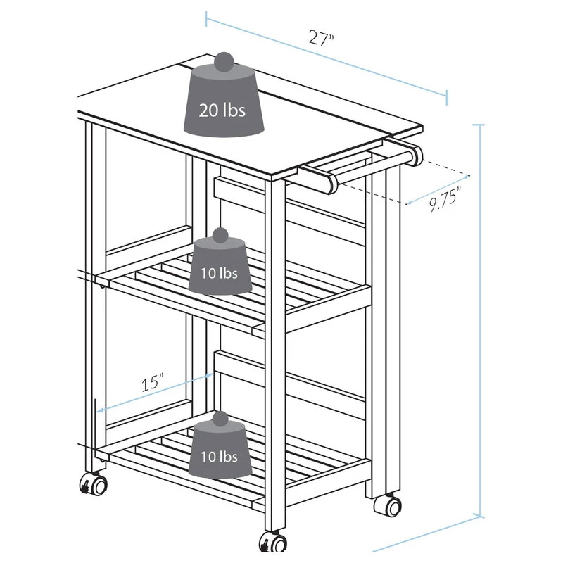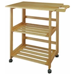 The unique feature of this wooden serving cart is that it requires no tools to setup and it takes less than a minute. The Trek Folding Kitchen cart is the perfect addition to any kitchen that could use some extra counter space. Its details are manifested in the beauty of solid wood in natural finish. A space saver that store easily for kitchen with tight space. Featuring a 27″ x 19″ food prep safe top, two shelves, and a towel bar to keep your kitchen cooking essentials close at hand when you need them. Lockable casters provide extra stability and mobility for multiple occasions.