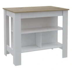 The Tuhome Modern Engineered Wood White Cala Kitchen Island brings not only style and functionality to your kitchen but also has properties. The tabletop is made with a clean protective film that contains silver nanoparticles. The large tabletop provides an open work area/display shelf. Below the tabletop, you will find one side with two shelves for additional storage space. The bottom shelf is split into two equal sections, all of them are perfect for displaying any décor, pots, pans or having kitchen utensils handy when you need them; The other side is designed to be a working station where you can sit with leg room to comfortably prep your meals. This two-tone finished piece is sure to draw the attention of your guests.