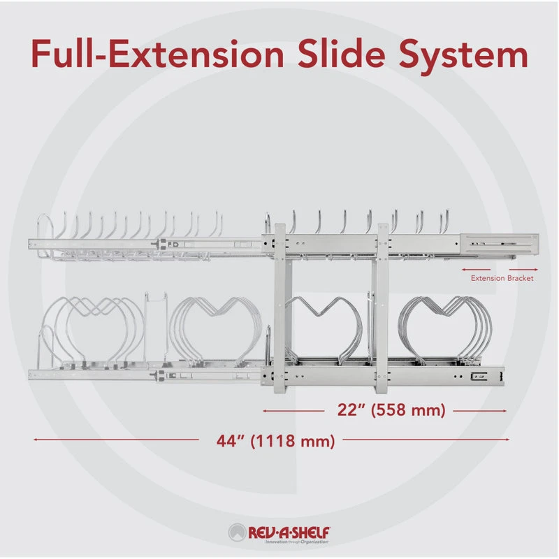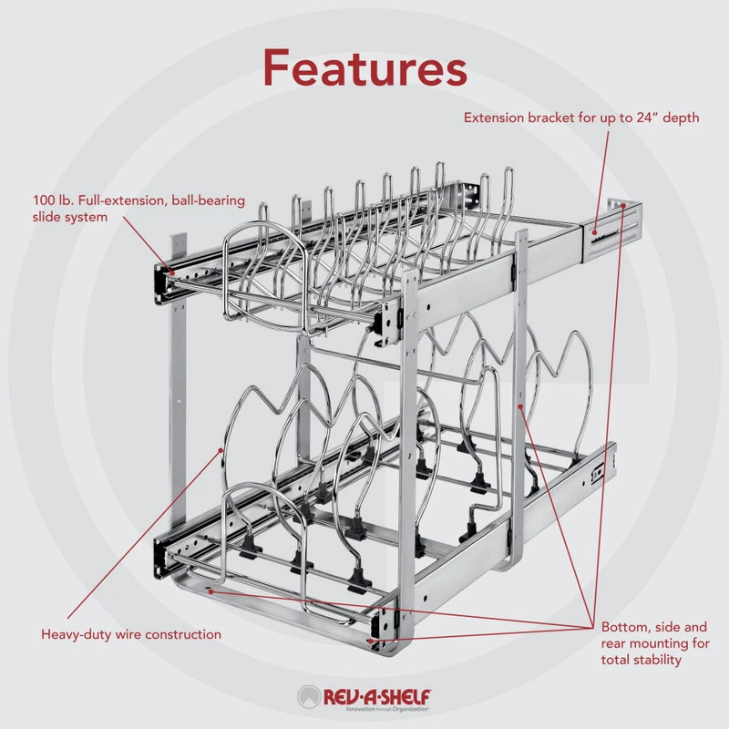 Revolutionize the way you store your pots, pans, and lids with Rev-A-Shelf’s Two-Tier Cookware Organizer. The 5CW2 features independently operating shelves that accommodate a variety of cookware sizes and brands. The top tier organizes lids and the bottom tier features adjustable dividers to store a variety of larger pots and pans. Made with a heavy duty chrome plated wire frame and 100 lb. rated full-extension ball-bearing slides. The bottom, side, and rear mounting provide you the sturdiness you expect and easy installation. Optional Door mounting kit available with the 5WB-DMKIT.