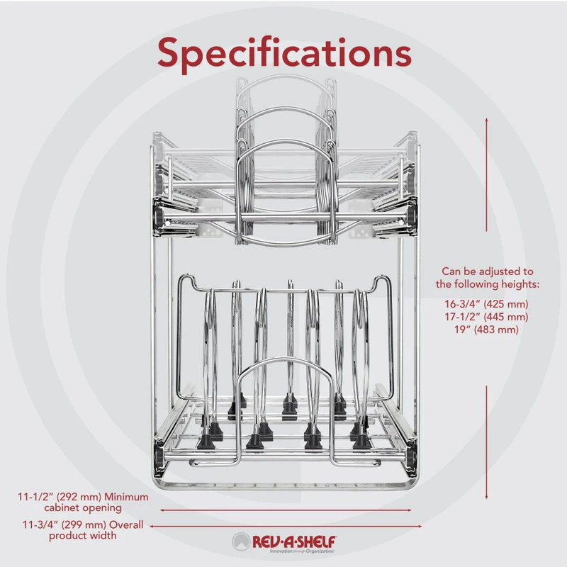 - Included: (1) Chrome two-tier cookware organizer, dividers and mounting hardware