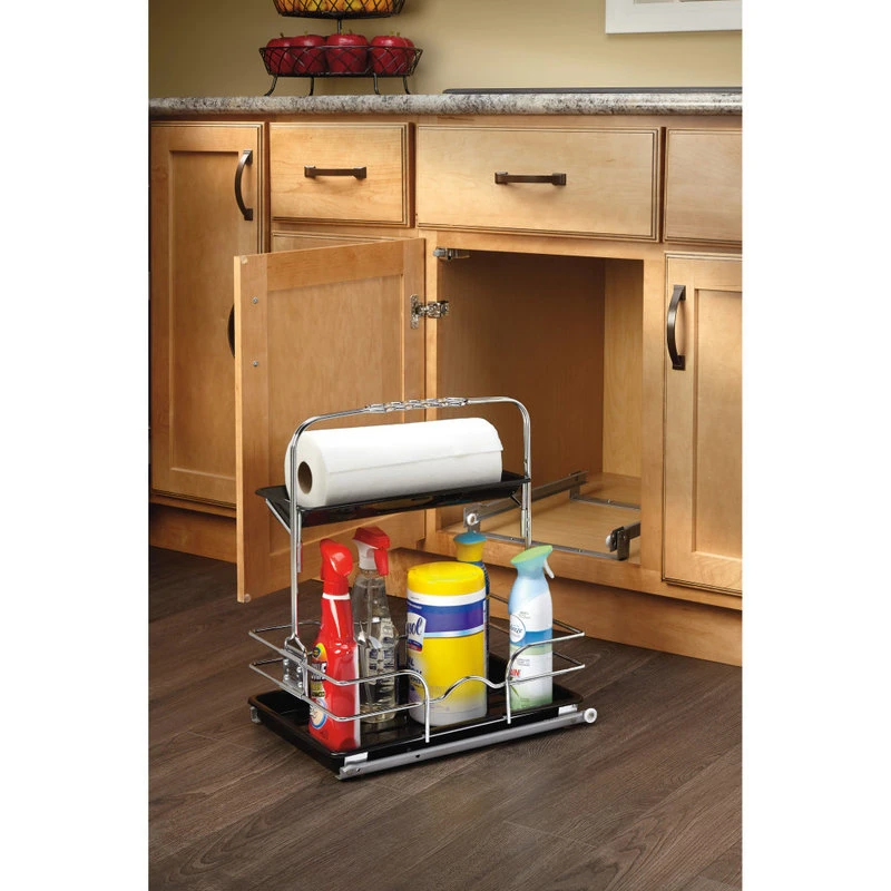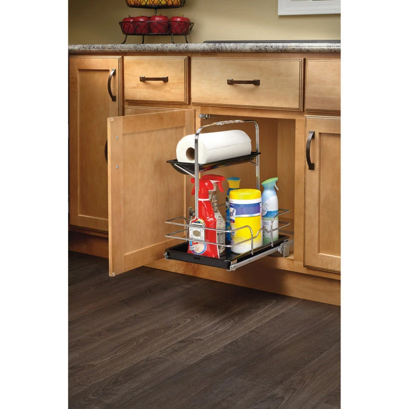 Cleaning just got easier with Rev-A-Shelf’s Cleaning Caddy. Now you can store multiple cleaning items in one place and carry them with you with the removable caddy. The unique handle adjusts to accommodate plumbing fixtures and the reversible/ removable top tray is ideal for paper towel or sponge storage.