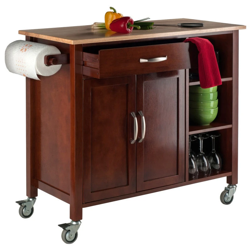 Bring polish and function into your kitchen with the two-toned Mabel Kitchen Cart. The natural wood top made of solid Beechwood is a lovely contrast with the darker Walnut-finished cabinet. The cart top provides a wide surface area workspace, while the handsome body offers plenty of storage opportunities. Keep dishes, glassware, or cookbooks on any of the three open shelves. The cabinet, accented with modern satin nickel handles, offers additional storage space for serveware, mixing bowls, food processor, and more. Keep silverware, kitchen tools, or accessories in the drawer and use the wooden cart handle as a towel rack or for paper towels. The unit rolls easily on professional-grade casters, two of which are locking. Made of solid and composite wood. Overall size is 42.7″W x 18.9″D x 35.4″H. The cart has three open shelves and a large cabinet with an additional shelf. Both the drawer and cabinet doors are accented with Satin nickel handles. Two of the rolling casters lock to keep the unit stable while in use. Cart made of solid and composite wood. Assembly required.Overall size is 42.7″W x 18.9″D x 35.4″HTable top size is 39.3″W and 18.9″DOpen shelves are 11.1″W x 15.6″D x 8.7″H Cabinet dimensions 22.4″W x 15.8″D x 21.6″H Inside drawer dimensions 21.1″W x 15″D x 35.4″HShips in 1 boxFeatures