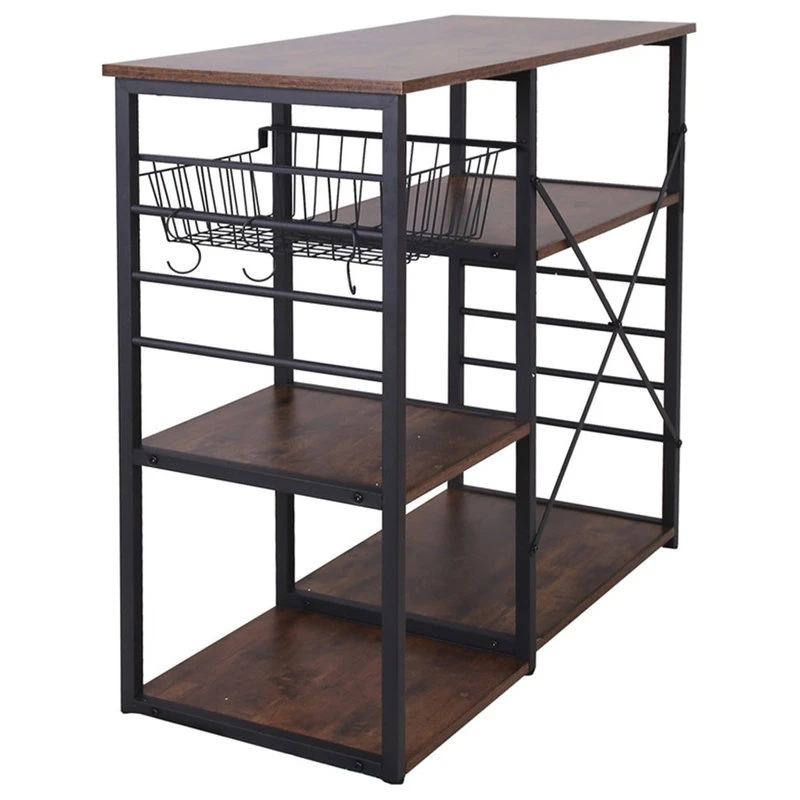Wood and Metal Bakers Rack with 4 Shelves and Wire Basket, Brown and BlackEmbellish your kitchen and dining space by bringing in this versatile Bakers Rack which offers spacious storage with 4 open shelves and a wire basket. Incorporated with 6 hooks and criss cross design on the back, it is accented with rustic brown and black finish.