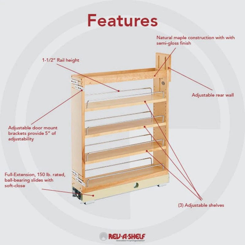 If you’re tired of cluttered, unorganized and hard to access cabinets, then look no further than Rev-A-Shelf’s pullout shelving system. This innovative series of pull-out organizers are available in a variety of sizes (depth, height and width) and are available in a variety of style to accommodate any type of kitchen. From baking sheets, spices, cutting boards, utensils and even knife organization. No kitchen is complete without one of these organizers and it will change how you use your kitchen. All units require a full-height cabinet (where no drawer is above) and cabinet door must attach to gain the full features of the unit.
