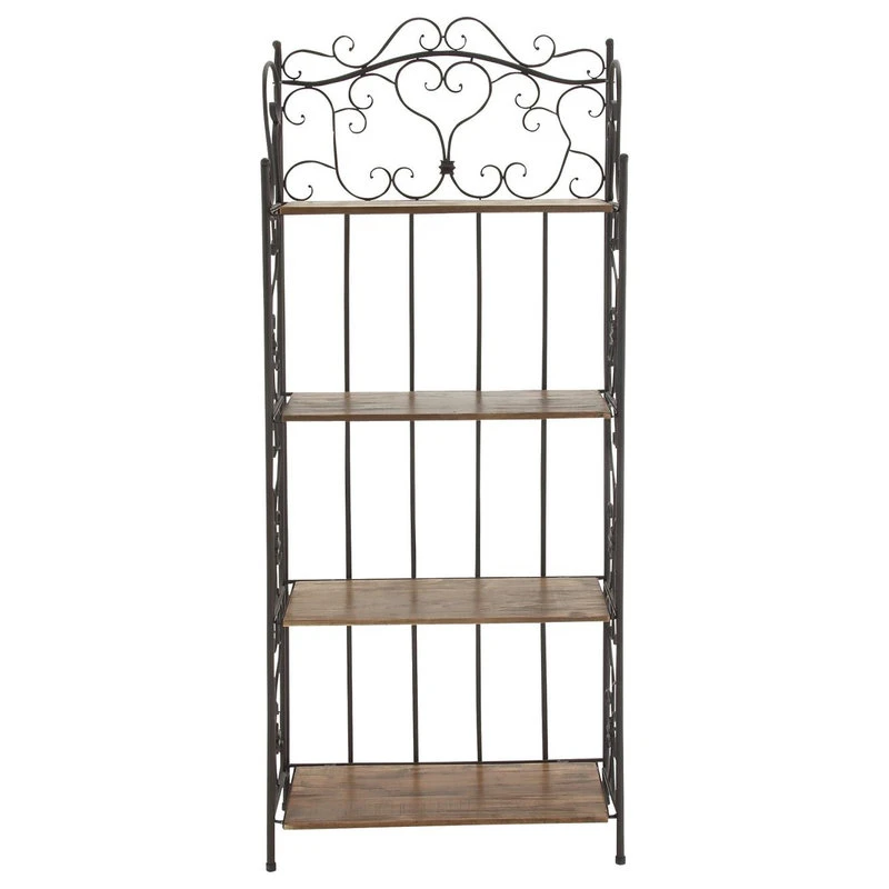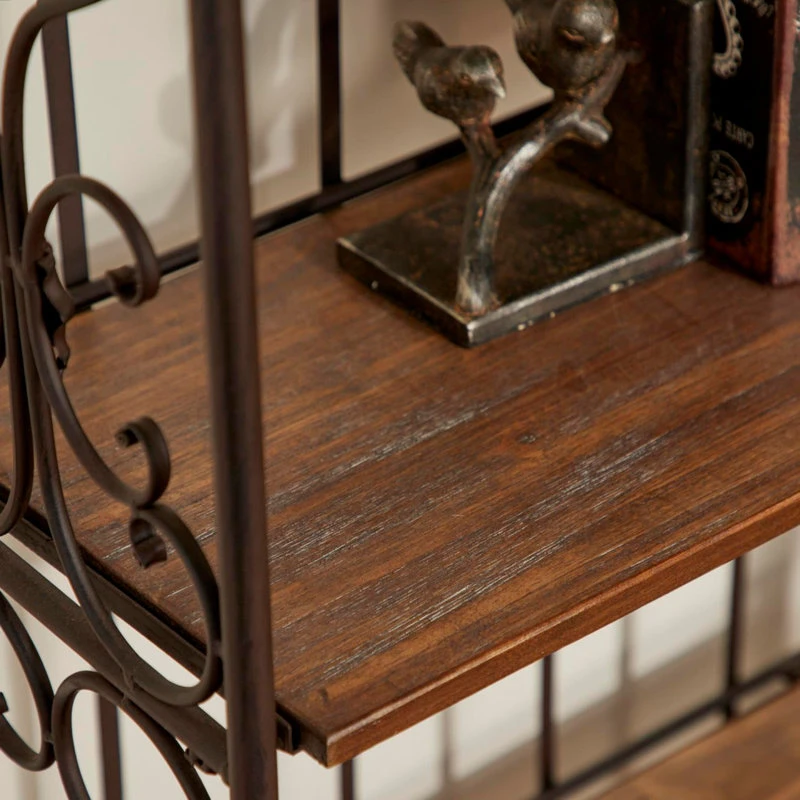 68″ Organic Inspired Rustic Iron Four Shelf Baker’s Rack, wooden shelves, scrolled top and sides, vertical grill back, rectangular base, footed